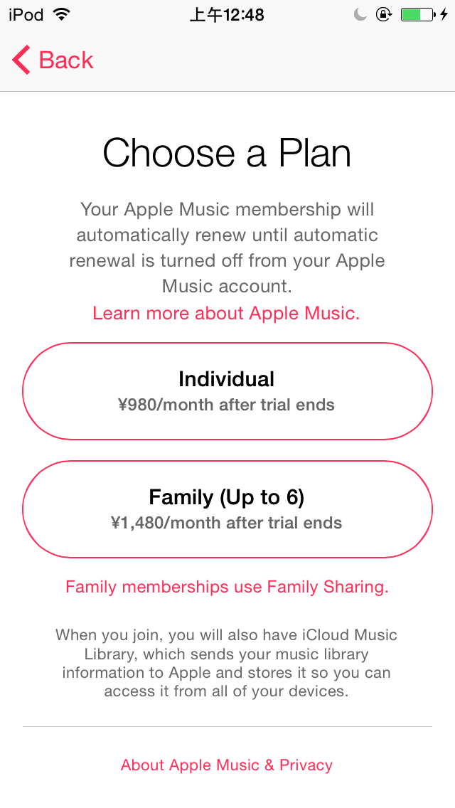 (筆者在iPhone上忘了cap圖,只好在iPod上重新cap一次。價錢方面,$48是個人方案,而家庭共享則需$78)