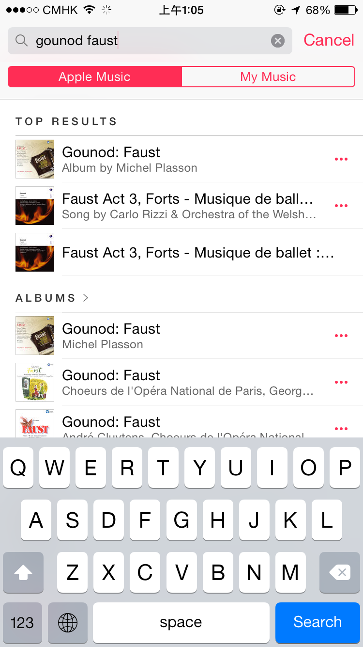 ▲搜尋音樂的介面。不過略嫌載入速度有點慢。你亦可以在Apple Music和My Music之間切換。
