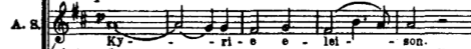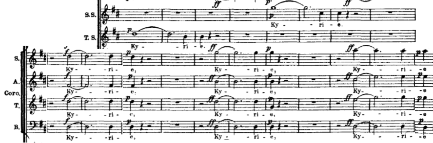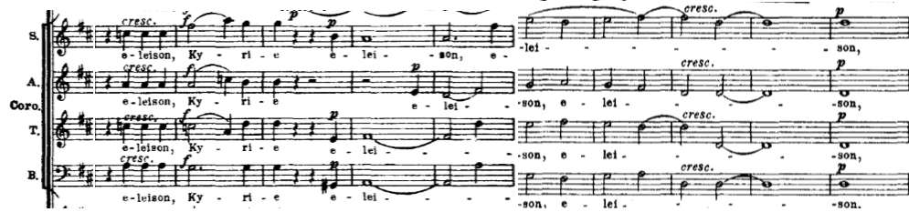m. 21後半部份,在還充滿騷動情緒的背景中,合唱團以第一動機、並用飽滿舒適的強度唱出「上主」"Kyrie"。而在隨後的十小節裏,合唱及獨唱無縫交替、同節奏漸強,並以反覆三次呈現「上主」一詞,似乎是隱晦地道出 上帝是三位一體的這傳統教義。(雖然在精神本質上,此作是較傾向唯一神格論的,這點容後再説吧。) 同時,合唱在這裏的三聲「上主」,其音量皆以 [f/ff]至[p]的對比方式來處理{譜例1.4}。這使音樂中的張力以指數上升,再通過m. 31獨唱女低音那句如磐石般的「上主,求禰垂憐!」"Kyrie, eleison!",終於把沉重的「求禰垂憐」樂句部份給拖出來(留意,音樂仍是靜止的){譜例1.5}。mm. 35 – 49,這裏樂句再次出現上昇之勢。面對合唱的仰望和渴求, 上帝似乎仍是沒有回應。於是,音樂再次由[sf]回落至[p]。同時,音樂越漸變得悲嘆起來。mm. 49 – 55,器樂連續出現三次下行二度的音型[B – A – G – F#](三大一小)。這動機為音樂帶來下降之勢{譜例1.6}。隨後於mm. 59 – 73,這動機進一步使音樂中的勢能大幅下降。進入m. 73,此為這章音量最弱的部份,也是最欠缺勢能與張力的一句,但卻是這章中最真實的一句「上主,求禰垂憐!」{譜例1.7a}。木管部的[高 – 低 – 高]音型就彷彿是一個靈魂、一個意志最敬虔的(Mit Andacht)心跳聲{譜例1.7b}。此句畢後,mm. 81 – 85,音樂突然地重新獲得上昇之勢,並匆忙地在m. 86進入B段B小調賦格段。