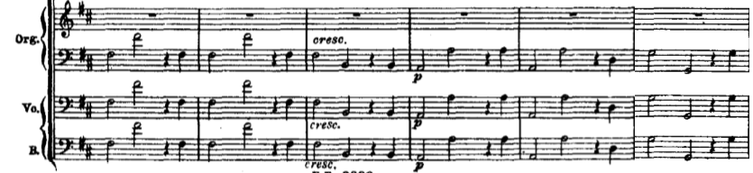 mm. 1 – 21為器樂序奏,全曲開首以一飽滿舒適的強音導入,奏出D大調主和弦,此刻音樂是凝聚、含蓄及不明亮的。加上小號與定音鼓在下一小節開首的四分音強音,更使音樂具有極強的不流動性。在這裏,首兩個半小節,緩慢沉重的附點節奏成為了A及A’段的第一個重要動機{譜例1.1}。當音樂行進至mm. 6 – 11時,單簧管首先奏出F5,m. 8時雙簧管奏出G5,m. 10時長笛奏出A5。在這裏,旋律線以二度音程、音階式的由下向上爬升,使音樂獲得上昇之勢,而 [dolce.]一字更加強了靜止的音樂中的張力{譜例1.2}。mm. 10 – 15木管部奏出第二個重要動機,而音樂亦在m. 14後半部份逐漸加強,至m. 17的 [sf]{譜例1.3}。我們在這刹那間能清楚窺探到一個靈魂極其迫切的渴求。他並不是渴求 上帝的憐憫,而是渴求與 上帝和解。這裏音樂中的張力充分展現出他渴求的仰望甚或是質問 上帝的意圖。不過在m. 17的首拍之後, 上帝似乎沒有回應。於是,音樂緊接僅以一小節的時值回落至 [p],但張力依然不減。