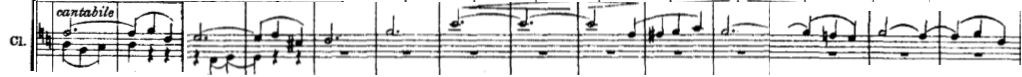 在m. 127器樂那一響無聲的「禰」後,轉調{譜例2.10}。音樂進入此章第二段落。此段速度比前段稍慢,長笛、單簧管及巴松管先於m. 128奏出降B大調屬七和弦,並以掛留音延長時值{譜例2.11a}。m. 130,欠缺長笛下單薄的和聲隨著大提琴、低音大提琴及管風琴的低音F的進入與維持,卻指向了深度的內在{譜例2.11b}。這裏的降B大調跟〈垂憐經〉中的B小調賦格一樣,都是一個靈魂隱秘的禱告。m. 131,這靈魂的意志,以單簧管之聲,於天地之間盤旋。單簧管樂譜上[cantabile(如歌的)]標示為這句導入、甚或為整個第二段前半部份添上一層歌曲(Lied)的悲劇性。在m. 137的繃緊後,單簧管(音樂)舒展起來,於m. 141與圓號奏出此段的第一動機{譜例2.12}。獨唱男高音於m. 145緩緩唱出「為禰之大榮耀感恩」"Gratias agimus tibi proptet magnam gloriam tuam"。獨唱女低音、女高音、男低音依次拋出他們的感恩。在這裏,音樂表面上雖然舒緩伸展,但其實命運 – – – 就在這動機裏面、就在這結構裏面、就在這調性裏面。如前文所述,此段帶有相當的歌曲悲劇性:在命運當中(與《貝九》不同,她是抽身的),我們只能為 上帝的大榮耀感恩,這其實是在乞求垂憐。