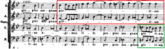 緊接合唱女高音,mm. 14 -16,合唱女低音、男高音、男低音依次回歸音樂中;合唱再透過短促的呼喊「榮耀」及完全不具巴赫影子、比巴赫還要巴赫的對位法,大大增加了音樂的張力與升力,使頌讚聲飛升到「至高天」處(暴露無飾的高音)。
