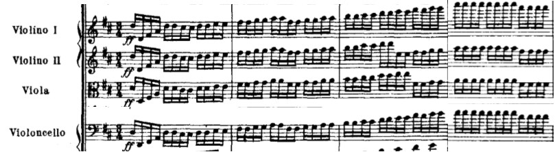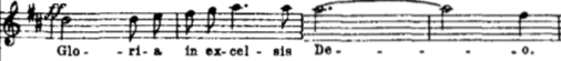 再仔細觀察,此動機與文本相互配合:「榮耀歸與至高」"Gloria in excelsis"處使用了上行二度音階、[長 – 短 – 短 – 短 – 短 – 長 – 短]節奏,充分刻畫出一個靈魂發出的頌讚向天府爬升的境象;而「 神」"Deo"一字則在高音域處停留了六拍{譜例2.3},如此戲劇式的長(高)音,叫人遙想到作曲家真正古典主義時期的作品,如《英雄交響曲》、《橄欖山上的基督》、《普羅米修斯的造物》及《艾格蒙序曲》等,她們衝刺時那英雄式的長(高)音型樂句。在這些作品裏,音樂所頌讚的是一個英雄的模型,或稱人性最高之體現。人文歷史上,凡被稱為英雄的,皆因其以良知作出了善的選擇。所以所謂英雄,其實都是被驅逐的神祗,因他們都露出了作為人的懦弱。他們雖然害怕,但最終也克服了恐懼;並在苦路上(注意是受難前)已高唱著勝利回歸的凱歌:「我的苦難即將過去,我救贖的工將要完成;不久死亡與地獄將被擊潰,此戰(我)將徹底得勝。」(註)此處動機(甚或全作)所頌讚的,明顯不是 父、而是被驅逐的 子(雖然驅逐這一元素在十架上才出現)。在這裏,音樂向教會作出退讓,以間接、經折射的方式(傳統教會音型及文本)顯出其意義。亦因為這樣,造成了此章甚或此作「被束縛」的難解風格。歸根究底,這都是因為作曲家始終都不肯歸信 父。