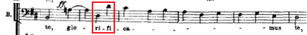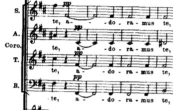 m. 83末拍,合唱男低音與上句無間斷地由[pp]跳回[ff],唱出「榮耀禰」"Glorificamus te",這是此章的第二動機。其上升八度的音型顯示出這已是最高的榮耀,所謂「八度音程是極限」{譜例2.8}。其後,合唱男高音、女低音、女高音依次跳進來,以答句形式唱出動機,並形成此章第一段賦格。(重點仍在「禰」)。此中,前三句(不論是音型或文本)再次出現(注意「敬拜禰」仍是只有一聲)。m. 103,換合唱男高音先跳回第二動機,合唱男低音、女高音、女低音依次跳進來。動機獲急速發展,織體密度愈來愈高{譜例2.9a}。但仔細看,合唱女高音一部何其單純{譜例2.9b},加上m. 117合唱四部齊聲呼喊一聲「榮耀禰」{譜例2.9c}、以及其後器樂重複此一音型的強調;我們能夠發現這段所謂賦格,並非真實的複調,亦非真實的旋律。