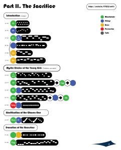 夜幕低垂,場景轉至一座高聳入雲的聖山上。貞潔的少女在長老們的陪同下,進行神秘的儀式。音樂比過往變得更怪奇,有如在悲鳴一樣。其中一位少女在儀式中被捉到,無疑她已被豐饒之神也尼路選中,成為祭品。其餘的少女亦上前祝賀她得到這份榮譽。祭祀儀式正式開始,音樂立刻澎拜起來,不規則的拍子旋律相繼出現。少女亦慢慢移動身軀,開始跳起神聖之舞。同時,長老召喚先人的英靈,見證祭典。代表著祖先的各種木管相繼出現,小號不斷吹奏著少女的動機。伴隨著粗獷的音樂,祭祀不知不覺來到尾聲。樂曲已達至狂暴的境界,少女體力漸漸不支,最後木管輕聲吹奏,少女倒地死亡,獻祭完成。